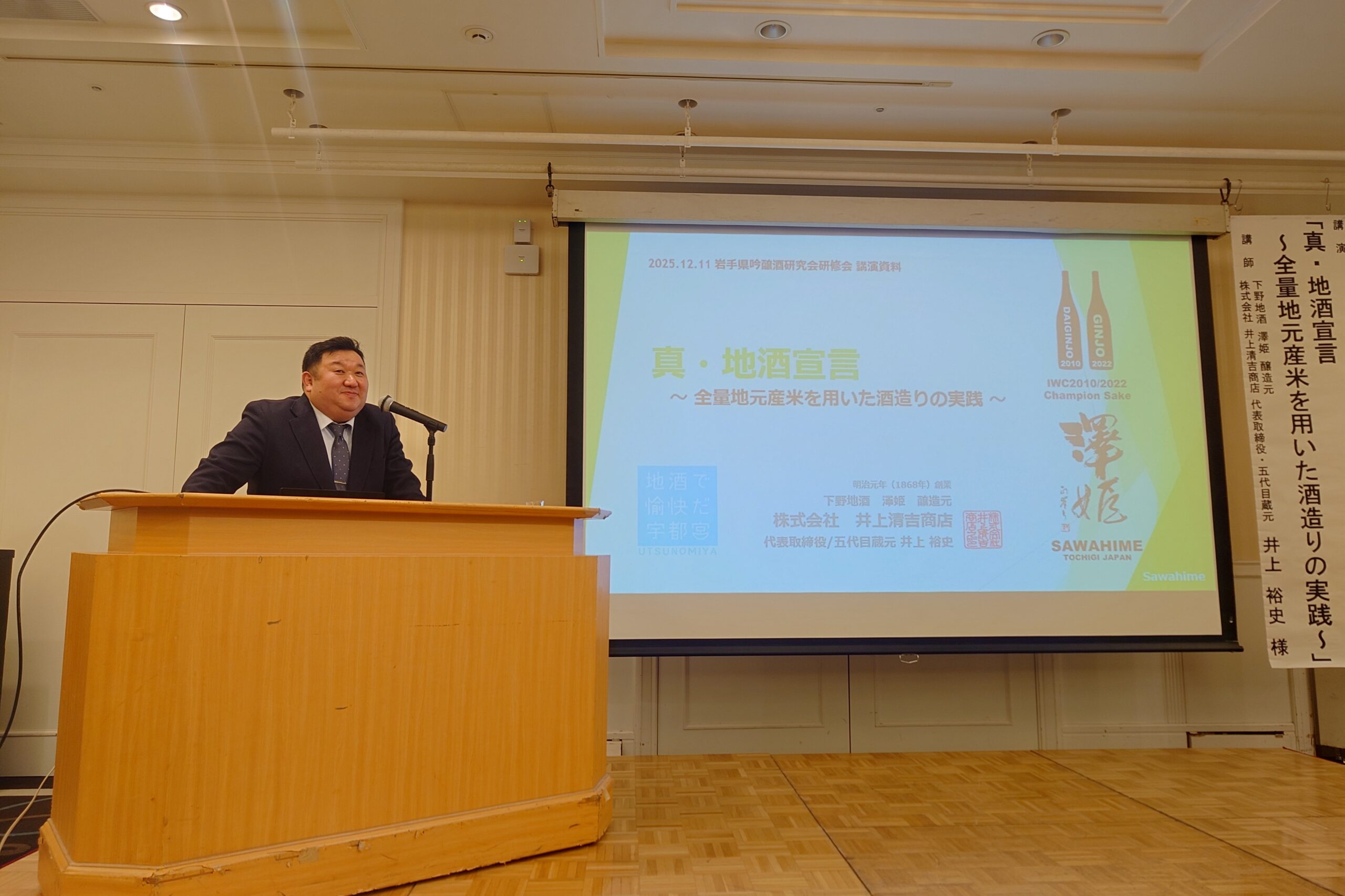 岩手県酒造組合が主催する製造技術講習会と吟醸酒研究会が盛岡市のメトロポリタンニューウィングで開催されました。仙台国税局鑑定官室から秋の東北清酒鑑評会をデータで振り返りながら様々ご指導をいただき、ゲスト講師として栃木県の「澤姫」の井上社長においでいただき、真・地酒宣言について様々な角度からお話しをいただきました。大変勉強になりました。県内の若い杜氏の皆さんと交流も深めることが出来、今期の酒造りに大きな力になると思います。